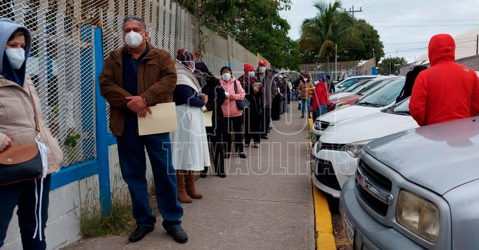 Altamira, Tamaulipas. - La aplicación de la vacuna anti Covid-19 para adultos mayores de 60 años en el CBTis 105 de Altamira se salió de control, al grado de que los abuelitos se estuvieron aglomerando y causando filas de hasta dos cuadras sin importar el frío; la señora Evelia Flores denunció que llegaron personas de Tampico y Madero a poner el desorden.