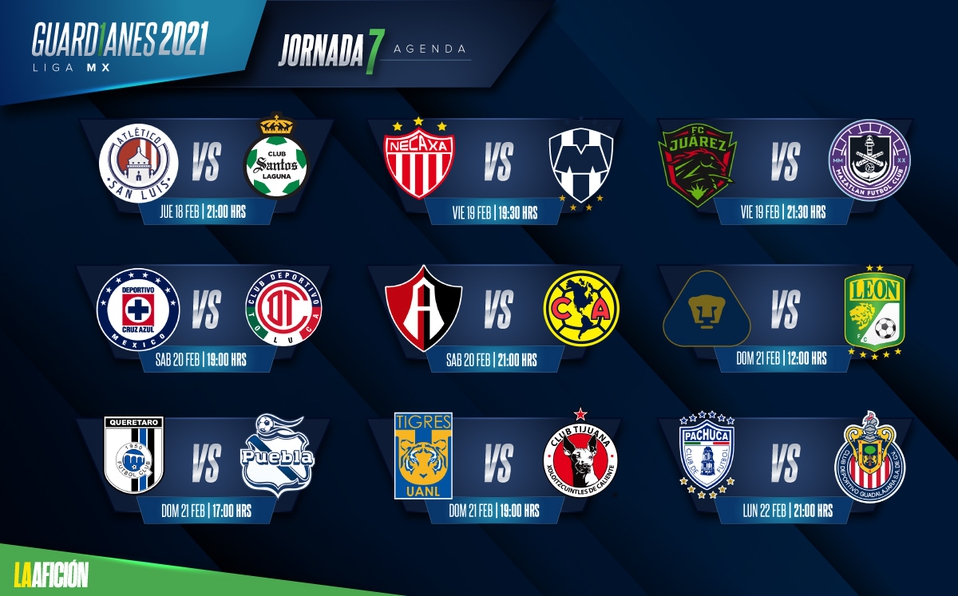 Ciudad Victoria, Tamaulipas. – Ya hay fechas y horarios para la jornada 7 del Guard1anes 2021 de Liga MX, pues comenzó con el Atlético de San Luis ante Santos Laguna, por lo que ahora continuará este viernes 19 de febrero con doble cartelera, primero la visita del Monterrey a la casa de Necaxa a las 19:30 horas, para luego seguir con el FC Juárez ante Mazatlán.