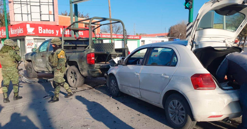 Nuevo Laredo, Tamaulipas. ─ Al no respetar la luz roja de un semáforo, un elemento de la Secretaría de la Defensa Nacional (Sedena) provocó un accidente vial en la Avenida César López de Lara, en Nuevo Laredo, en el cual sólo se reportaron daños materiales.