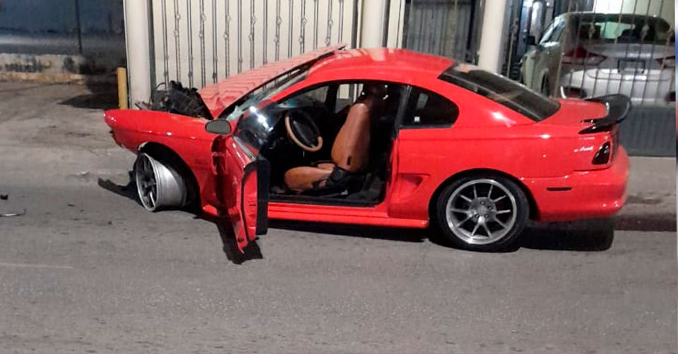El accidente ocurrió esta madrugada cuando el vehículo Ford Mustang era guiado de sur a norte sobre la Avenida Hidalgo, y después de pasar la corporación vial el conductor perdió el control del volante, proyectándose contra el citado negocio, para terminar, prácticamente destruido a la altura de la Ferrolana.