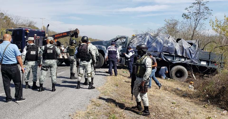 Ciudad Victoria, Tamaulipas. - Dos sub agentes de la Guardia Nacional (GN) resultaron lesionados esta mañana luego de volcar el camión que tripulaban, en el kilómetro 5+900 de la carretera Rumbo Nuevo, tramo Victoria-Jaumave.