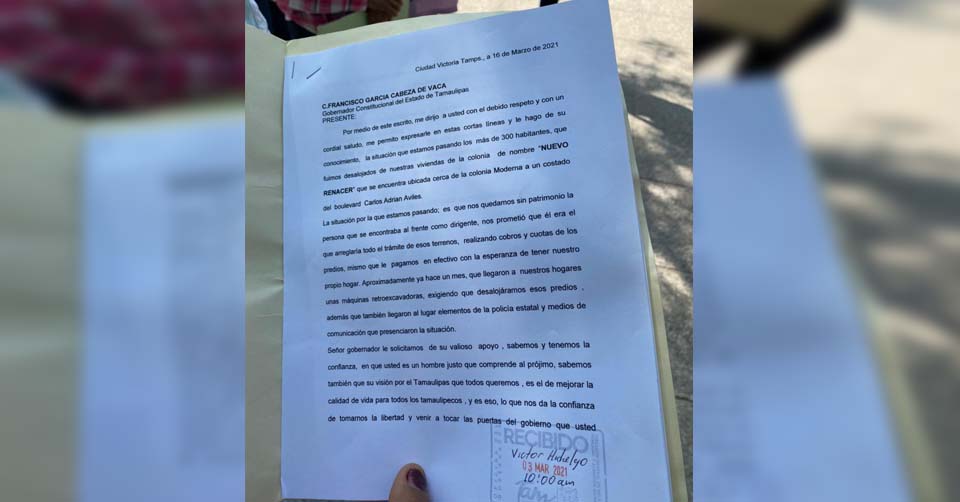Ciudad Victoria, Tamaulipas.- Los habitantes de la colonia Nuevo Renacer que fueron desalojados hace un mes de sus predios, acudieron al Palacio de Gobierno de Tamaulipas, para solicitar la intervención del gobernador, Francisco García Cabeza de Vaca, para que el Instituto Tamaulipeco de Vivienda y Urbanismo (ITAVU) les venda un terreno para poder vivir.