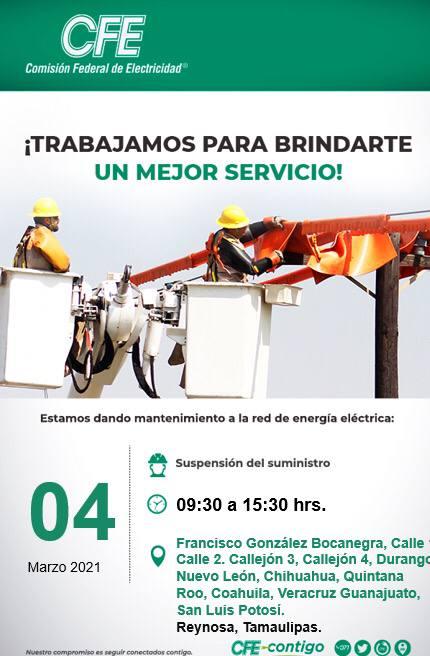 Reynosa, Tamaulipas.- La Comisión Federal de Electricidad (CFE) anunció que mañana jueves, cuatro de marzo, suspenderá temporalmente el servicio de energía eléctrica en un sector de Reynosa.