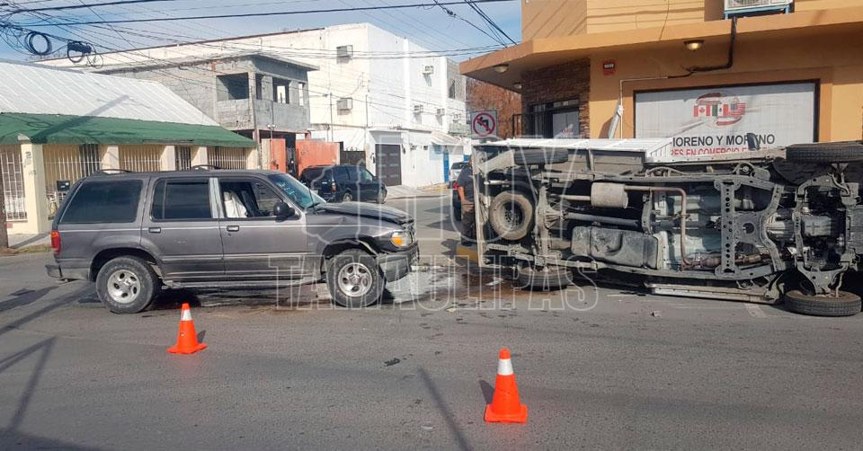 Nuevo Laredo, Tamaulipas. ─ Un adulto mayor olvidó la señal de alto y chocó contra una camioneta de reciente modelo, misma que por lo fuerte del impacto terminó volcada en calles del sector Centro de Nuevo Laredo.