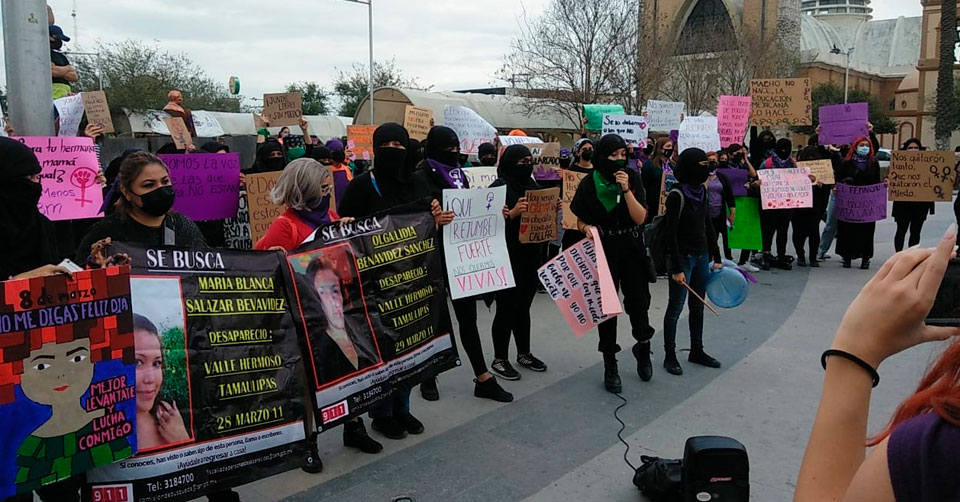 Reynosa, Tamaulipas. - Alrededor de un centenar de mujeres se manifestaron está tarde en la ciudad de Reynosa, con el propósito de conmemorar el Día Internacional de la Mujer y para exigir se dé un alto a la violencia contra las féminas.