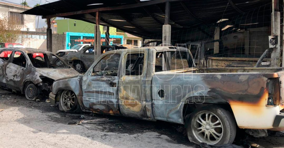 Matamoros, Tamaulipas. - Siete camionetas fueron consumidas por las llamas al registrarse un incendio por un posible corto circuito en el taller de hojalatería “El Chaparro”, donde además una perra pitbull que cuidaba el sitio, murió calcinada.