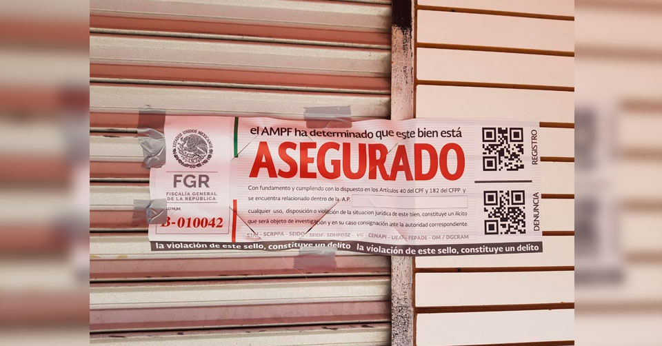 “Con fundamento y cumpliendo con lo dispuesto en los Artículos 40 del CPF y 182 del CFPP y se encuentra relacionado dentro de la A.P. Cualquier uso, disposición o violación de la situación jurídica de este bien, constituye un ilícito que será objeto de investigación y en su caso consignación ante la autoridad correspondiente”, se puede leer en el sello de la tienda de Grupo Textil Esparto situado en la calle 11 y 12 Hidalgo.
