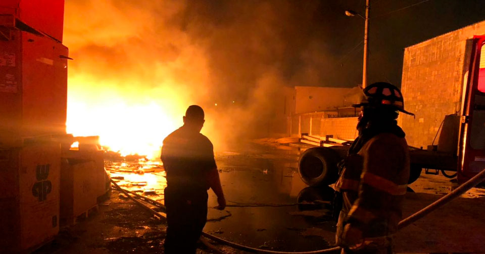 Matamoros, Tamaulipas.- Una recicladora de cartón y plástico fue consumida por las llamas, aunque ya los bomberos y Protección Civil están en el sitio tratando de controlar el siniestro.