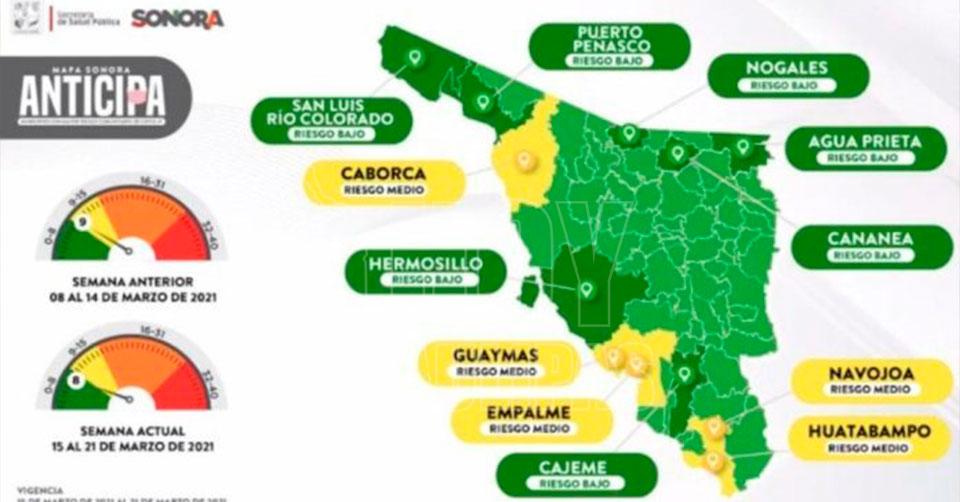 Asimismo, por el comportamiento de la contingencia se clasificaron en riesgo bajo los municipios de San Luis Río Colorado, Hermosillo, Cajeme, Puerto Peñasco, Nogales, Agua Prieta y Cananea.