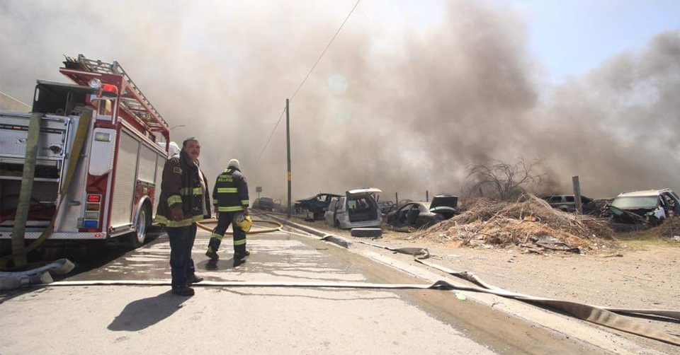 Nuevo Laredo, Tamaulipas. ─ Al menos 400 vehículos quedaron destruidos al registrarse un incendio en cuatro yonkes ubicados sobre la Carretera Aeropuerto en Nuevo Laredo.