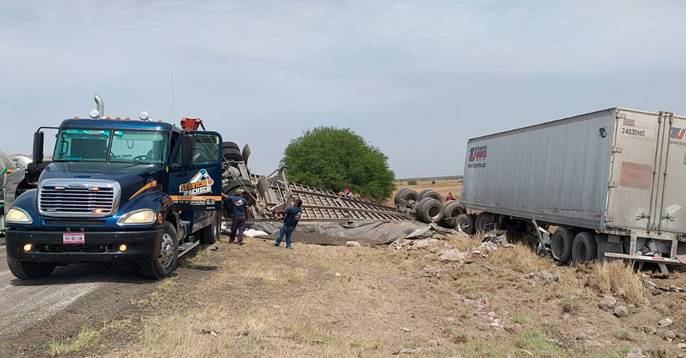 Ciudad Victoria, Tamaulipas. – Un tráiler articulado con dos contenedores cargados con 50 toneladas de azúcar volcó esta mañana en el kilómetro 57 de la carretera Zaragoza-Victoria; el producto fue trasvasado a otro contenedor.