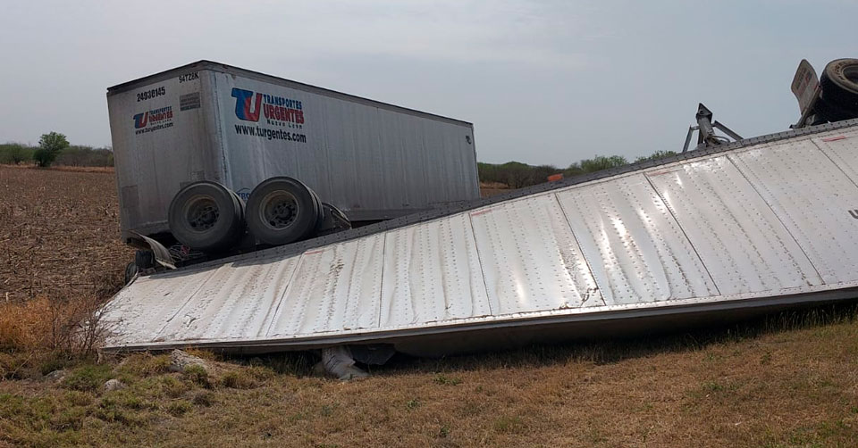 El tractocamión de la empresa Transportes Urgentes Nuevo León quedó convertido en chatarra al igual que la caja que quedó volcada.