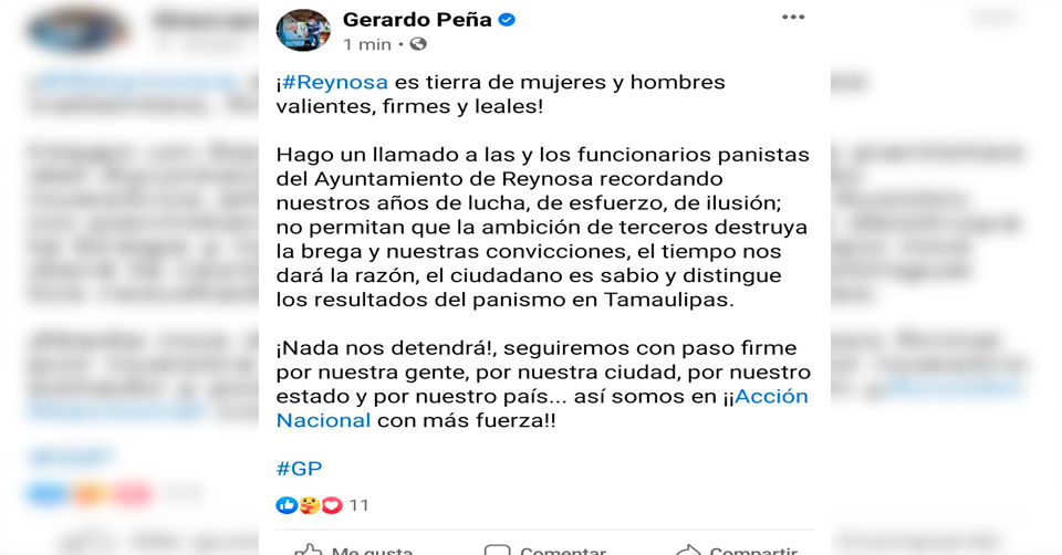 "Hago un llamado a las y los funcionarios panistas del Ayuntamiento de Reynosa recordando nuestros años de lucha, de esfuerzo, de ilusión”