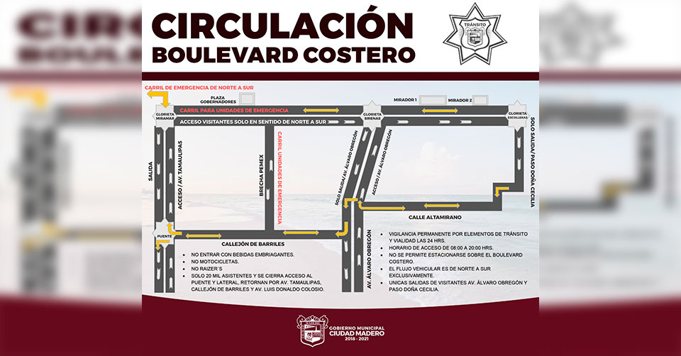 Ciudad Madero, Tamaulipas. - Durante el período vacacional de Semana Santa, la Dirección de Tránsito y Vialidad de Ciudad Madero, impulsa medidas de coordinación en el flujo de la circulación en los accesos a playa Miramar, por lo que pidió a los visitantes cumplir con las recomendaciones.