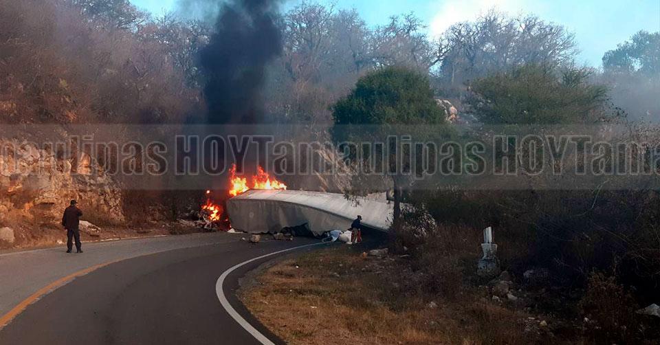 Tula, Tamaulipas. - Un chófer de un tracto camión perdió la vida trágicamente esta tarde-noche, luego de incendiarse la unidad luego de volcar en el kilómetro 40 de la carretera que conduce de Tula a Ocampo.