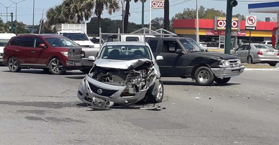 Tampico, Tamaulipas.- Un fuerte choque se registró al mediodía de este lunes, en donde por fortuna no hubo personas lesionadas pese a lo aparatoso del impacto.