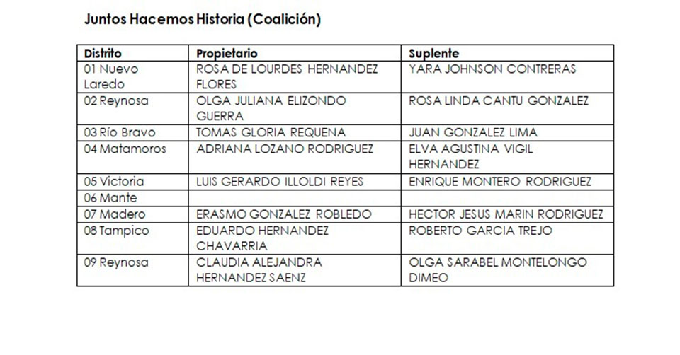 Es importante indicar que la diputación federal por Nuevo Laredo le correspondía poner candidato dentro de la coalición al partido Verde, quien había dado a conocer el nombre de Ana Laura Huerta, quien ya se encuentra haciendo campaña en esa ciudad.