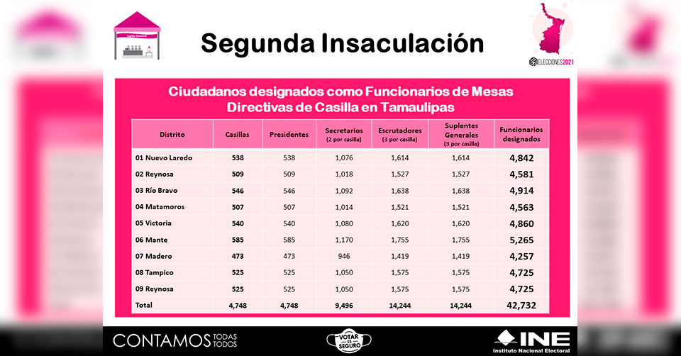 Ciudad Victoria, Tamaulipas. - Al concluir la segunda insaculación ciudadana en Tamaulipas, el Instituto Nacional Electoral (INE) incorporó 42 mil 732 ciudadanos como funcionarios de mesa directiva de casillas para la elección del próximo 6 de junio.