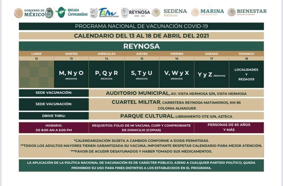 Este martes deberán acudir los adultos mayores cuyo apellido paterno empiece con las letras M, N, O, mañana miércoles los de apellidos con P, Q y R, el jueves los de apellido con S, T y U, el viernes los de apellido V, W y X, el sábado los que tengan apellido que empiece con Y y Z, y finalmente, el domingo los rezagados.