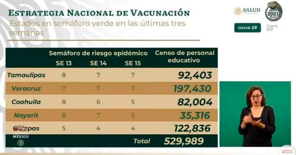 Ciudad Victoria, Tamaulipas. - Tamaulipas, Veracruz, Coahuila, Nayarit y Chiapas, serán los primeros cinco Estados en dónde se inicie la campaña de vacunación al personal docente, por lo que crecen las posibilidades del regreso a clases para el próximo ciclo escolar.