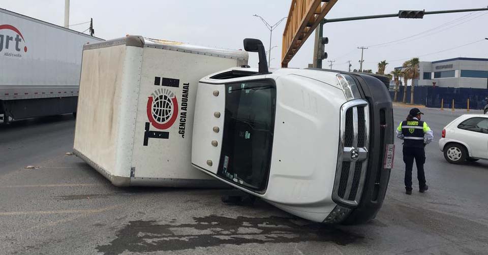 Nuevo Laredo, Tamaulipas.─ Tras chocar contra la estructura metálica en un retorno de la Carretera Aeropuerto, un conductor volcó en su camioneta de carga y sufrió golpes leves.