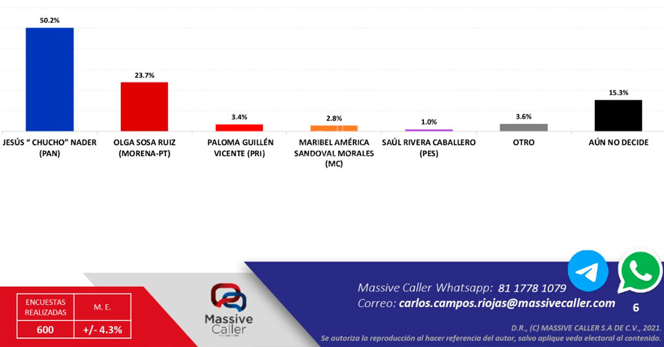 También se apunta que el sondeo realizado por Massive Caller estima que 15.3% de los consultados aún no decide por alguno de los partidos o candidatos que participan en la actual contienda electoral en esta ciudad.