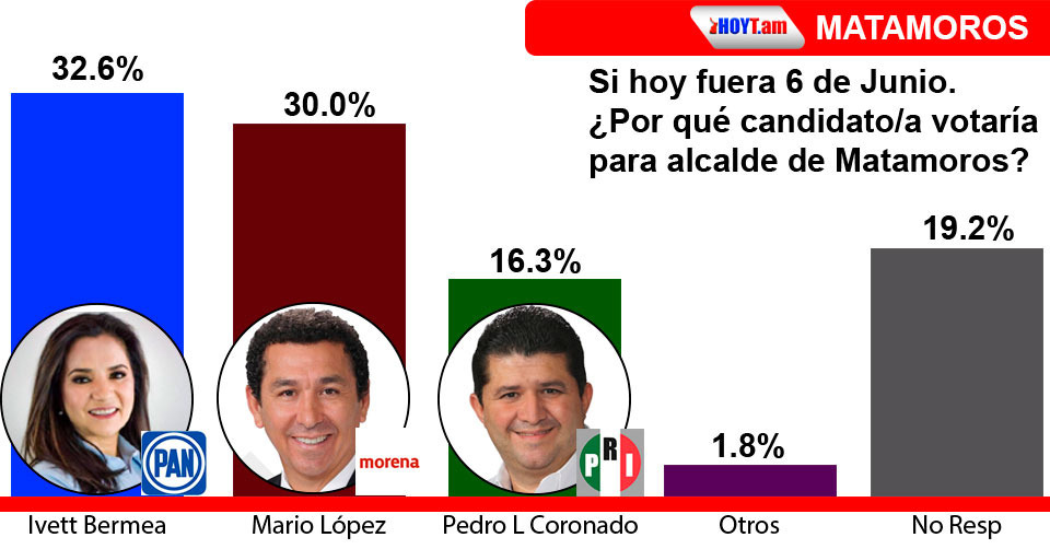 Matamoros, Tamaulipas. - La panista Ivett Bermea se convertiría en la próxima alcaldesa de Matamoros si hoy fueran las elecciones municipales, esto luego de contar con la mayor preferencia electoral tras la encuesta realizada por Marketing & Estrategias. La abanderada del Partido Acción Nacional obtuvo el 32.6 por ciento.