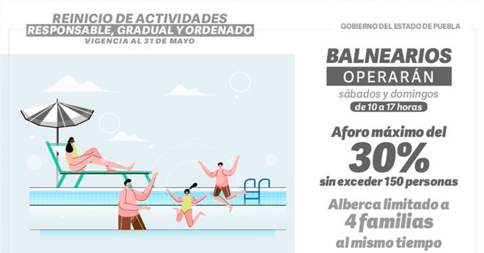 Para los balnearios, comentó, operarán sábado y domingo con un horario de 10:00 a 17:00 horas, y un aforo del 30 por ciento sin exceder las 150 personas. El uso de la alberca estará limitado a cuatro familias en un mismo momento y estará prohibida la presencia de grupos sonideros, musicales o de animación, así como la venta de bebidas embriagantes.