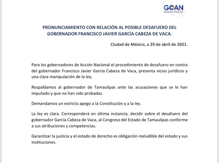 La GOAN señaló que el procedimiento de desafuero en contra de Cabeza de Vaca, presenta vicios jurídicos y una clara manipulación de la ley, en ese sentido, exigió un proceso en estricto apego a la Constitución y a la ley.
