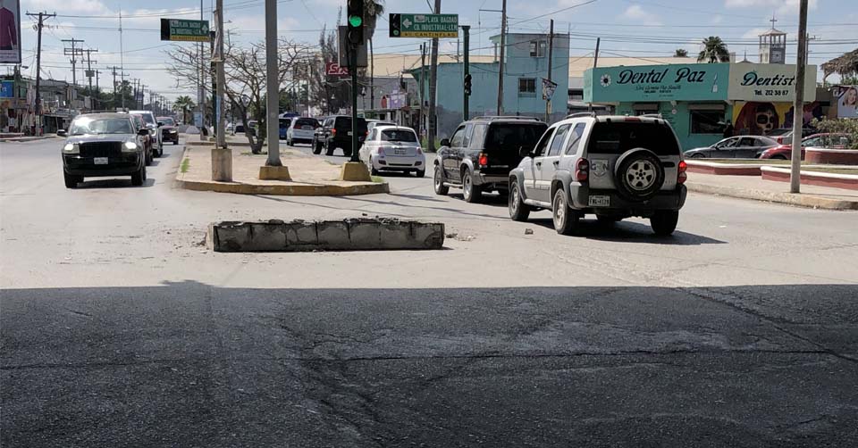 Matamoros, Tamaulipas.- El choque de una camioneta sobre tres muros de contención del puente vehicular de la Roberto Guerra y Periférico en Matamoros, originó que uno de ellos cayera sobre la carpeta asfáltica debajo de este paso a desnivel.