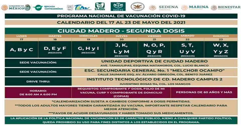 Ciudad Victoria, Tamaulipas. - La segunda dosis de la vacuna Covid-19 a adultos mayores de 60 años será aplicada a partir del próximo lunes 17 y hasta el 23 de mayo en el municipio de Madero.
