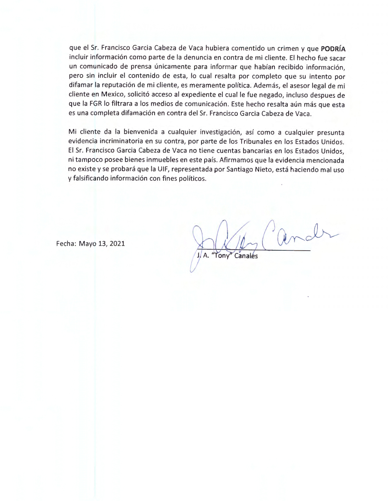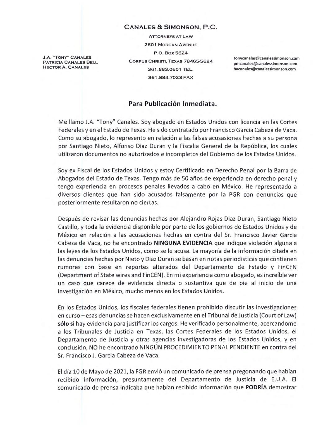 Para respaldar la seriedad de sus dichos, el abogado informa que tiene "Licencia en las Cortes Federales y en el Estado de Texas", que "Ha sido contratado por Francisco García Cabeza de Vaca y lo representa en relación a las falsas acusaciones hechas a su persona por Santiago Nieto, Alejandro Rojas Díaz Durán y la Fiscalía General de la República, los cuales utilizaron documentos no autorizados e incompletos del Gobierno de los Estados Unidos".