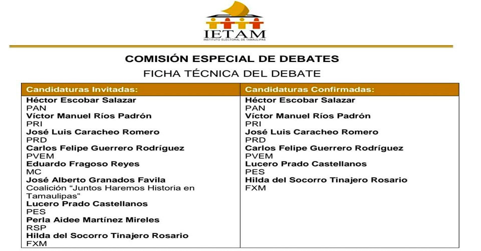Quienes no han confirmado su asistencia son Eduardo Fragoso Reyes de MC, José Alberto Granados Favila de la Coalición “Juntos Haremos Historia en Tamaulipas” y Perla Aidee Martínez Mireles de RSP.