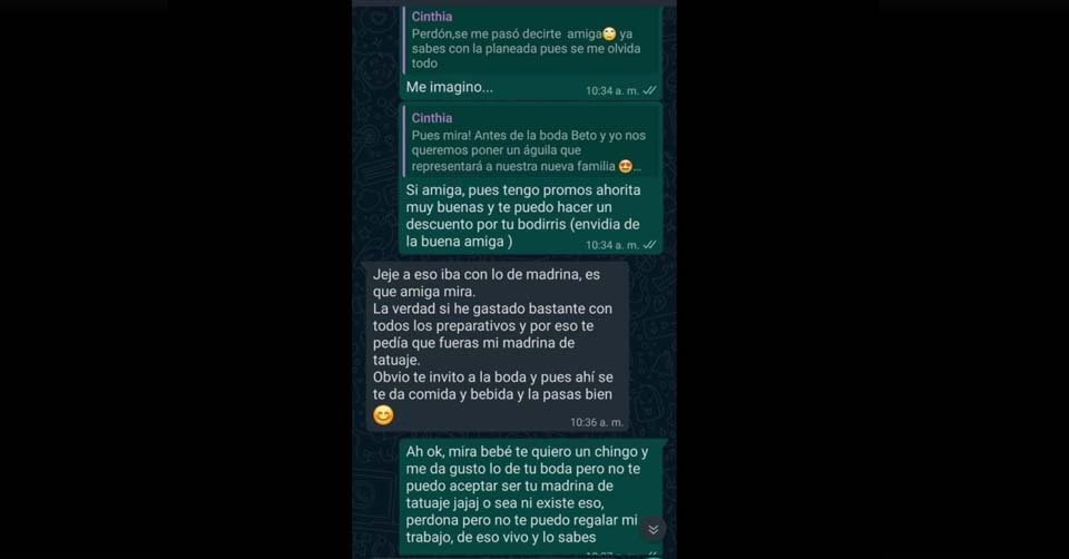 Puebla.- La supuesta amiga de una tatuadora la invitó a su boda a ocho días de que se llevara a cabo, solo para pedirle que fuera su madrina de tatuajes y no solo para ella sino para su prometido y todas las damas de honor, por lo que se ganó el merecido título de "Lady tatuajes" en redes sociales.