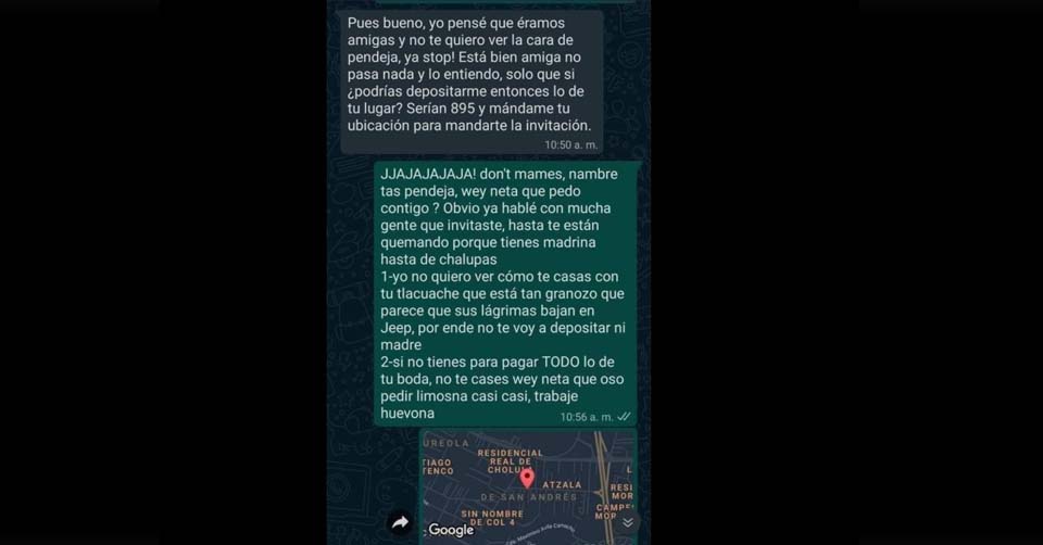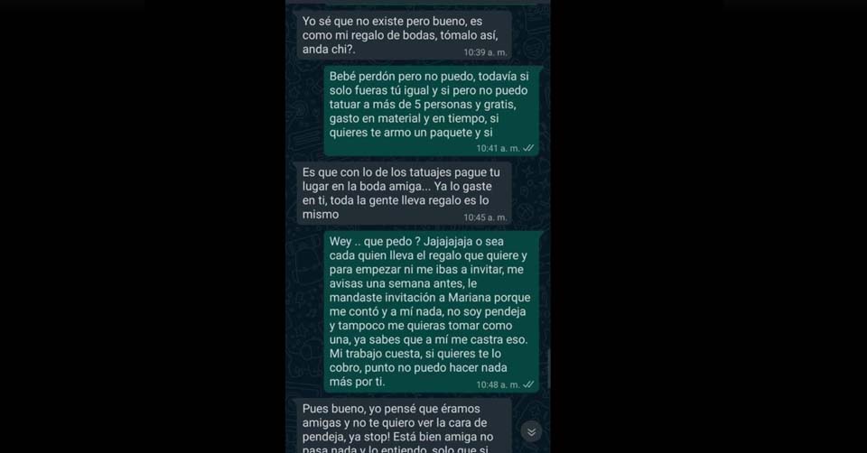 Ante la negativa la novia no se dio por vencida en obtener algo a cambio de invitar a la tatuadora a su boda, por lo que procedió a cobrarle su lugar por $895, con la excusa de que ya había gastado en ella.