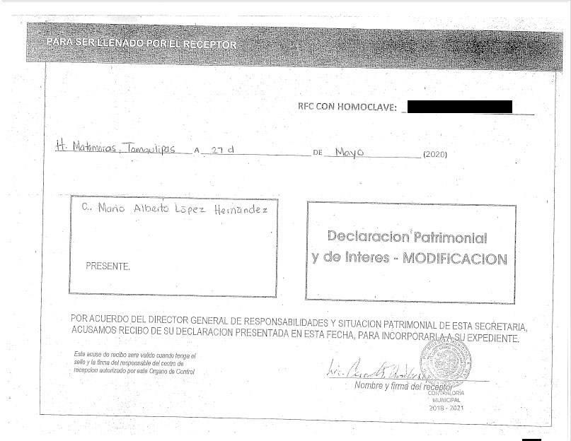 Matamoros, Tamaulipas.- El alcalde Mario Alberto López (MAL), no pudo explicar en su declaración patrimonial del 2019, presentada en el primer trimestre del año pasado, cómo le hizo para que él y su familia tuvieran ingresos por 3 millones 233 mil 484 pesos.