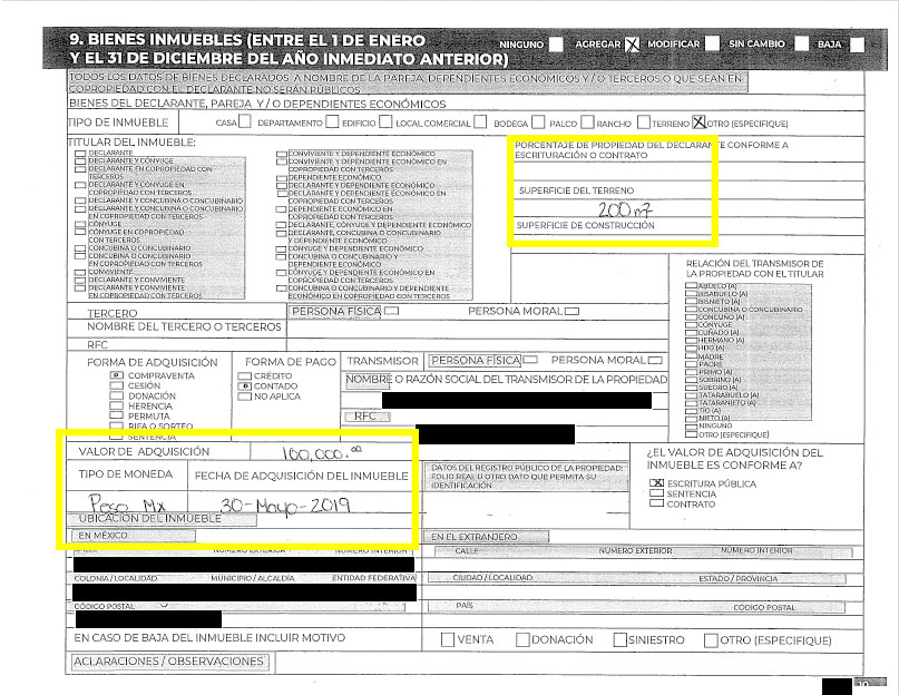 6.- El 30 de mayo de 2019, nueve meses después de tomar el cargo de Presidente Municipal, MAL alias La Borrega, se hizo de un predio con un valor de adquisición de 100,000.00 pesos.