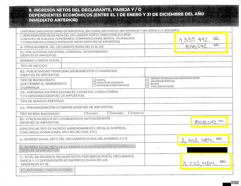 De su pareja o dependientes económicos (de quién no sabemos ni sus nombres porque no los señala en la declaración), se percibieron $820,000.00 que no sabemos de qué actividad provienen puesto que como se observa en la Declaración Patrimonial no hay datos de su pareja, ni dependientes económicos respecto a su situación laboral o empresarial. En total la familia percibió $3’233,484.00 pesos en 2019.