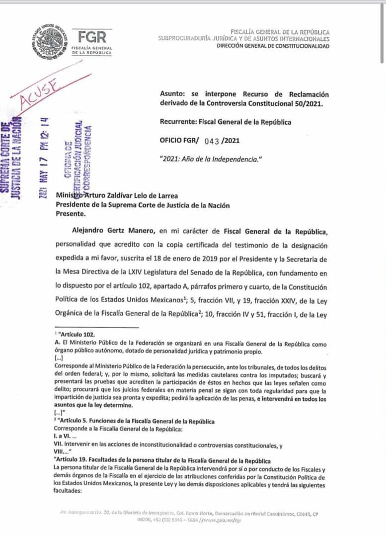 Ciudad Victoria, Tamaulipas. - La Fiscalía General de la República (FGR) impugnó la decisión del ministro Juan Luis González Alcántara de la Suprema Corte de Justicia de la Nación (SCJN) de desechar la controversia constitucional interpuesta por el Congreso de Tamaulipas ante el desafuero del gobernador Francisco García Cabeza de Vaca.