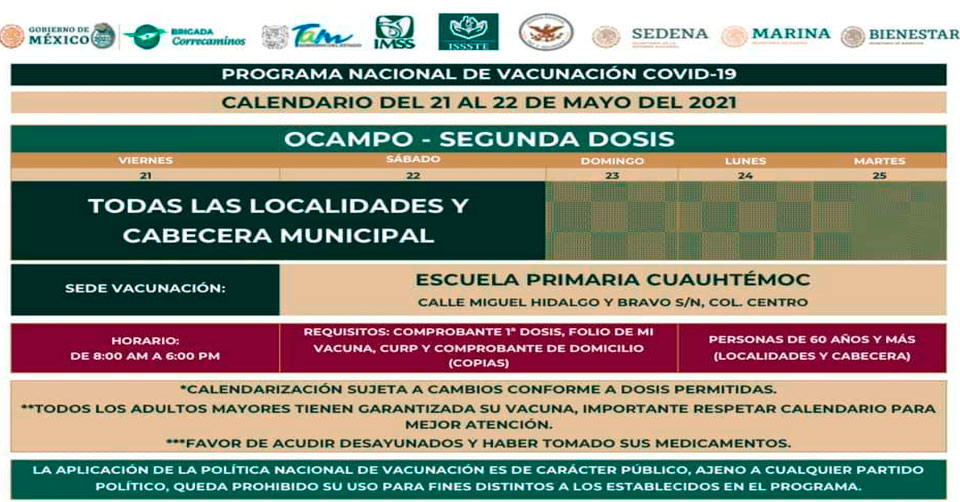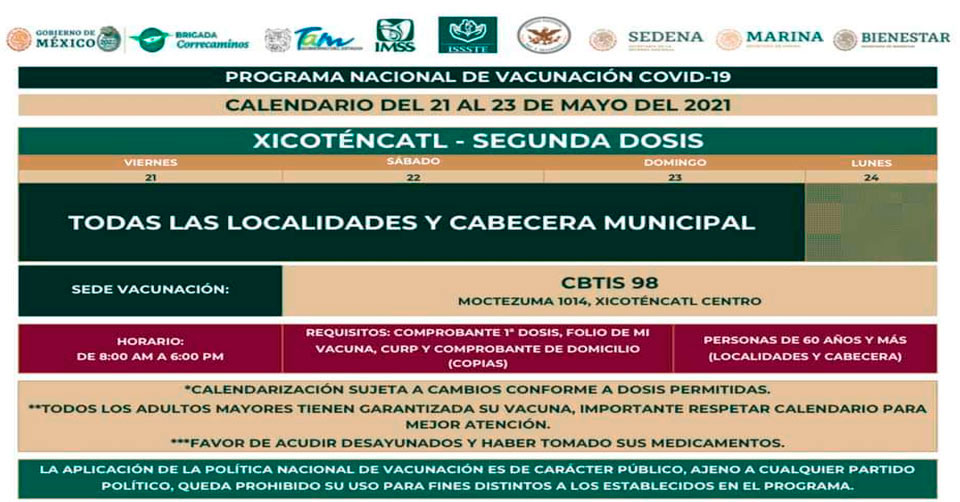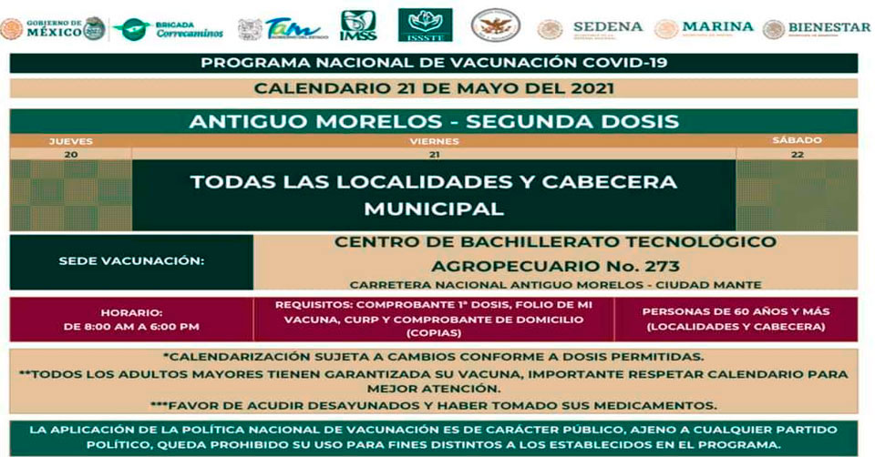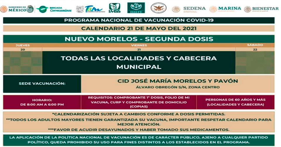 Destacó que los adultos mayores deberán presentar su folio de vacunación; llevar el comprobante de vacunación de la primera dosis y copia de comprobante de domicilio y CURP.