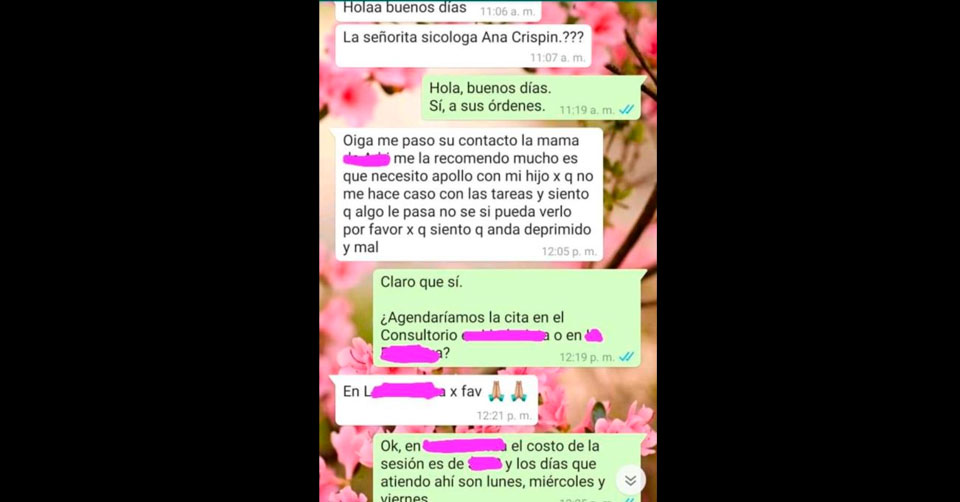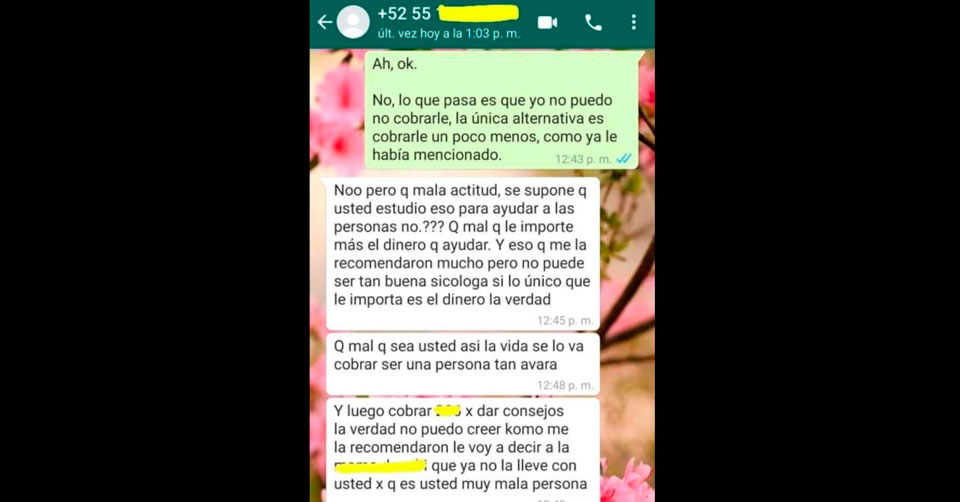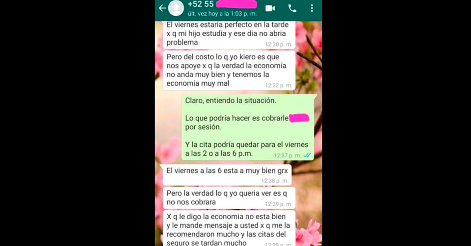 La profesionista aceptó y le indicó las fechas disponibles para cita, además del costo por sesión, ahí fue cuando la madre de familia le pidió su “apoyo” porque su economía estaba un poco complicada, a lo que la psicóloga accedió realizando un descuento.