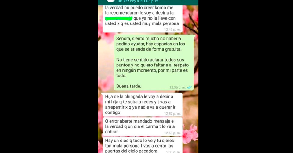 Sorprendentemente la profesionista decidió tomarlo de buena manera, aclarándole a la mujer que ella no reglaba su trabajo y que no quería faltarle al respeto, situación que molestó más a la madre de familia, quien decidió amenazarla en redes sociales, pero la que terminó siendo “quemada” por su mala actitud fue ella, aquí te dejamos la conversación.