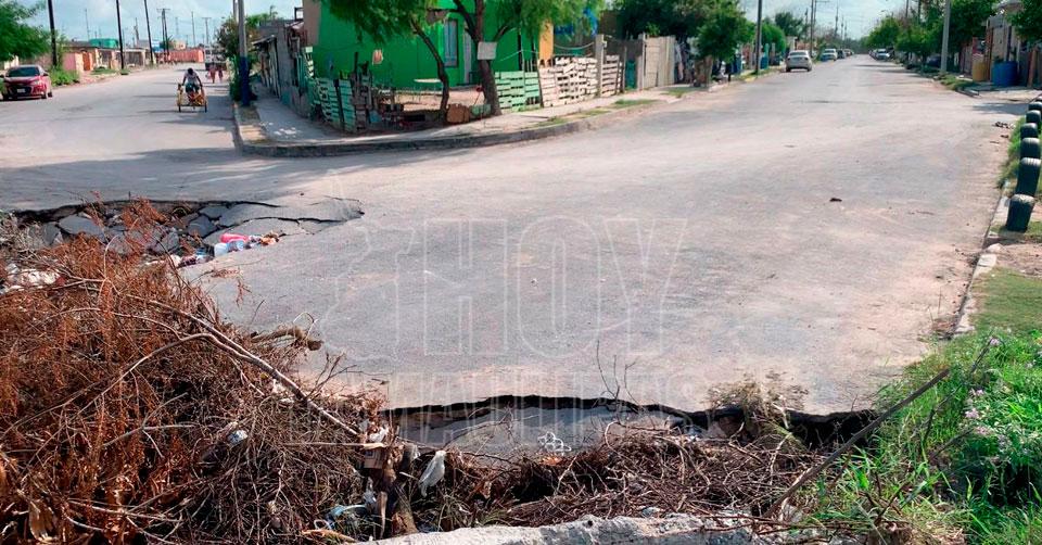 Matamoros, Tamaulipas. - Un socavón en la calle Santa Rita del Fraccionamiento San Miguel en Matamoros mantiene en incertidumbre a los vecinos, pues está a escasos metros de llegar a las casas y temen por su integridad y las de sus familias, ya que aseguran que han reportado a las autoridades municipales encabezadas por Mario López y hasta la fecha no han acudido.