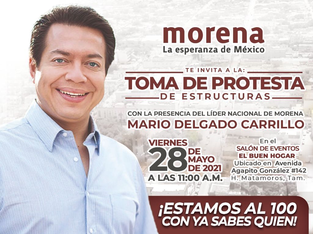 Este viernes 28 de mayo estará en Matamoros, Mario Delgado Carrillo, líder nacional de Morena, para toma de protesta de estructuras de su partido y de paso darle un respaldo a los y las candidatas que están contendiendo a la diputación federal, diputaciones y la reelección a la alcaldía.