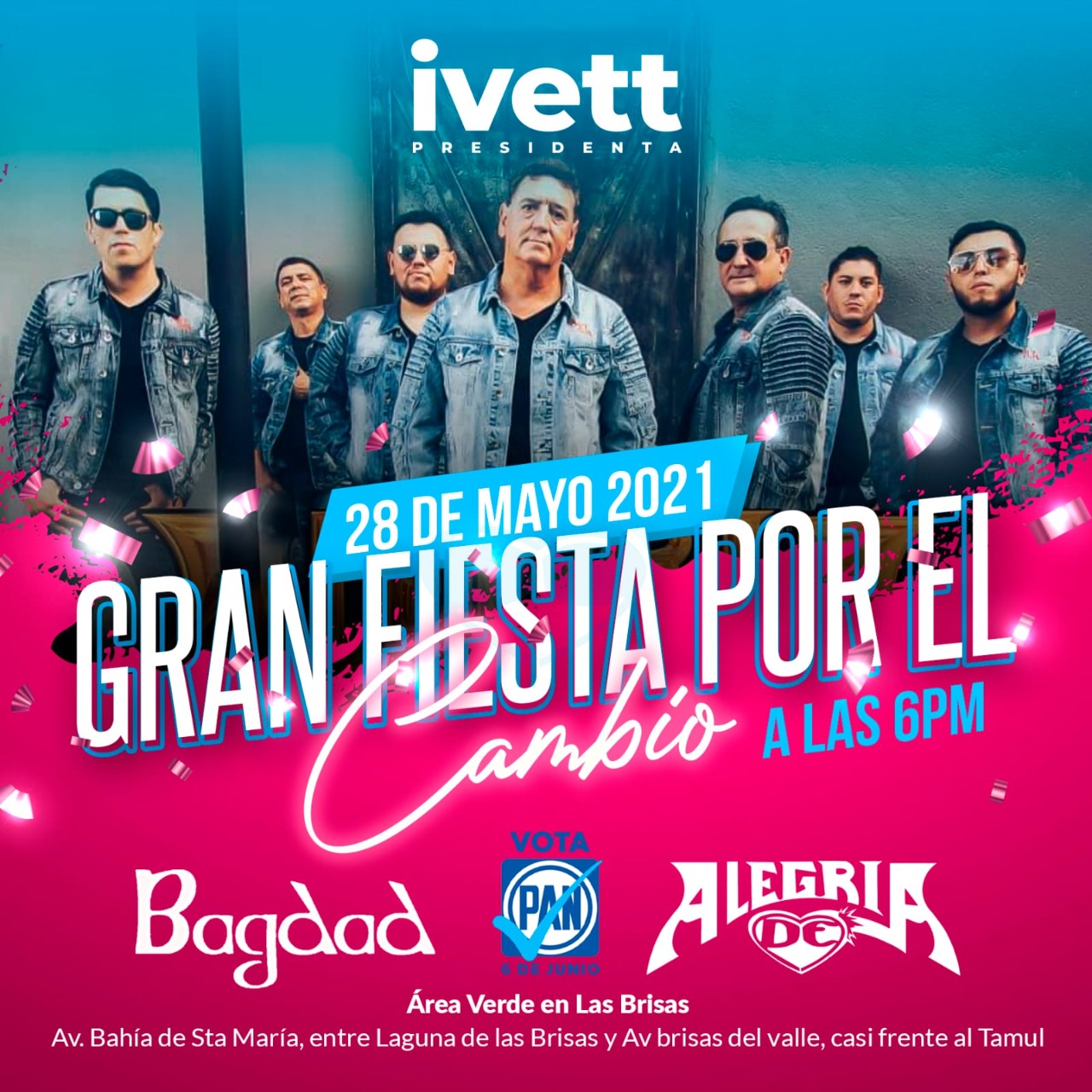 Matamoros, Tamaulipas. - La candidata del PAN a la presidencia municipal de Matamoros Ivett Bermea, invita a todas las familias matamorenses a disfrutar de un momento muy agradable en la Gran Fiesta por el Cambio y su cierre de campaña en el que se presentará entre otros grupos La Banda Limón, Alegría de Corazón, Grupo Bagdad, Grupo Cariño y Grupo Belén.