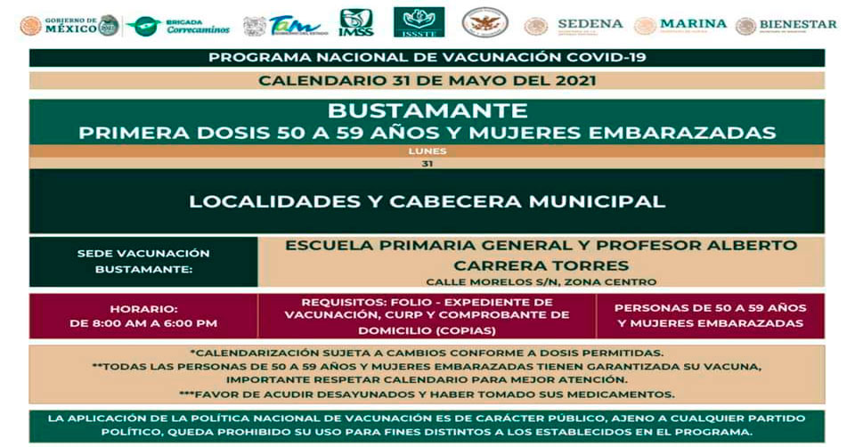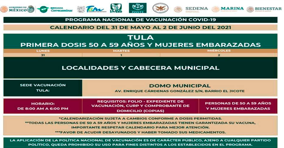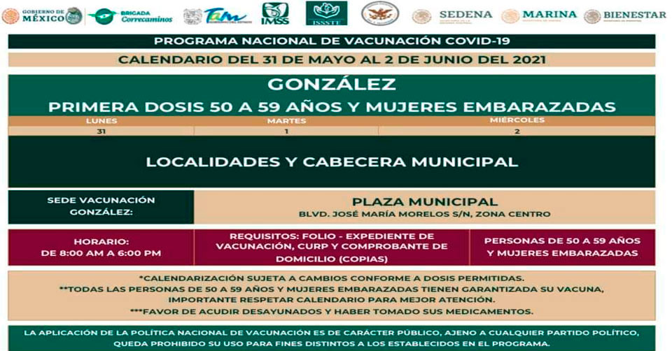 Ciudad Victoria, Tamaulipas. - El coordinador de Programas Federales en Tamaulipas, José Ramón Gómez Leal, informó que este lunes inició la campaña de vacunación contra el Covid-19 para mayores de 50 años y mujeres embarazadas en los municipios de Tula, González y Bustamante.
