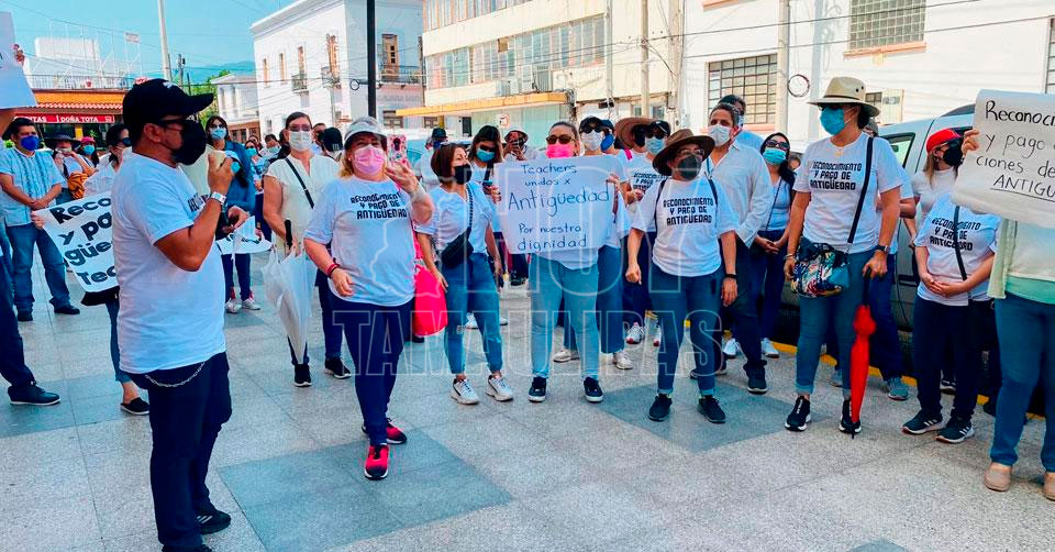 Ciudad Victoria, Tamaulipas. – Alrededor de 150 maestros de inglés de diferentes municipios del Estado realizaron una manifestación desde la Avenida Francisco I. Madero en su cruce con Carrera Torres y hasta el Palacio de Gobierno de Tamaulipas, exigiendo se les reconozca su antigüedad laboral y que se realicen las aportaciones correspondientes al fondo de pensiones del Instituto de Previsión y Seguridad Social del Estado de Tamaulipas (Ipsset).