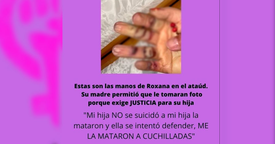 Los padres de Roxana Janneth aseguran que la autopsia realizada a su hija reveló que no se quitó la vida, sino, que murió por haber recibido tres heridas en el cuello, además de que su cuerpo presentaba múltiples hematomas y sus manos tenían lesiones causadas por un arma blanca, las cuales aseguran, fueron provocadas cuando Roxana intentó defenderse al evitar ser apuñalada.