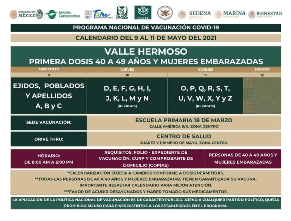 Ciudad Victoria, Tamaulipas.- El proceso de vacunación contra el Covid-19 a adultos de 40 a 49 años de edad y mujeres embarazadas en el municipio de Valle Hermoso, dará inicio el próximo miércoles 9 de junio, informó el coordinador de programas federales para el desarrollo en Tamaulipas, José Ramón Gómez Leal.