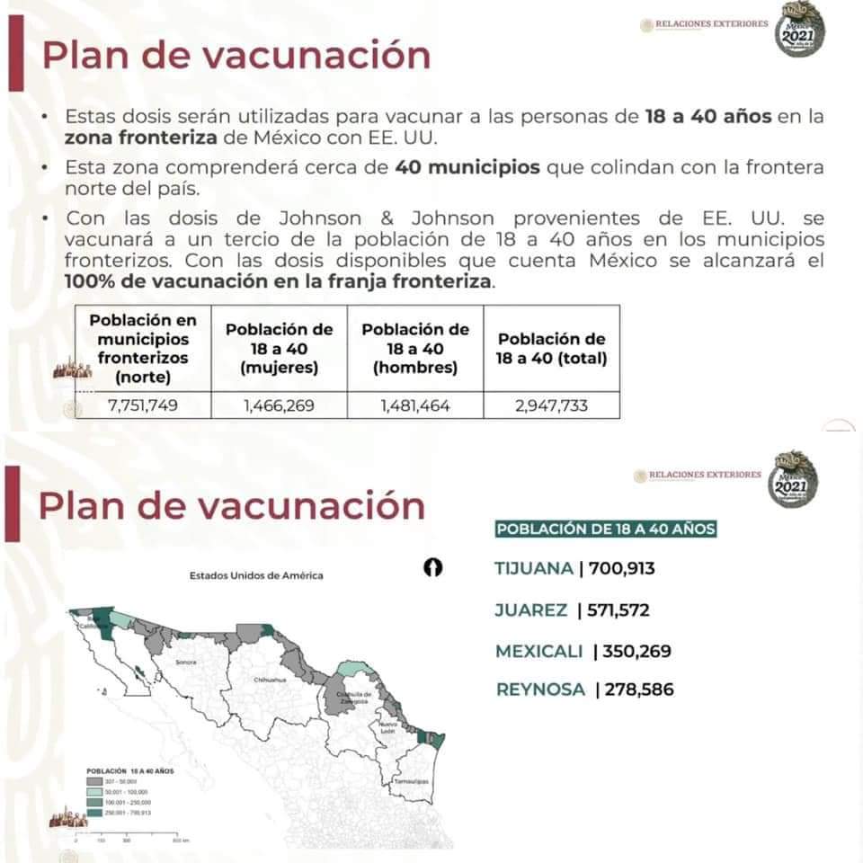 Explicó que el plan de vacunación se realizará con las dosis de Johnson & Johnson provenientes de Estados Unidos, y con las que se vacunará a un tercio de la población de 18 a 40 años en los municipios fronterizos.